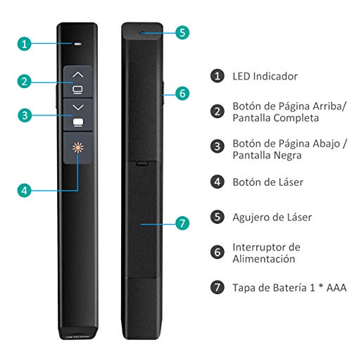 Es fácil de utilizar, ya que solamente necesitas conectar el receptor USB al ordenador portátil y dispone de tres botones con funciones, como página arriba y abajo, pantalla completa, pantalla negra y láser. Por otra parte, es de bajo consumo de batería e incluye luz indicadora para indicar si está descargado.